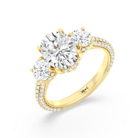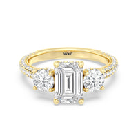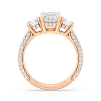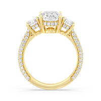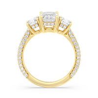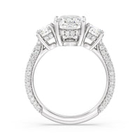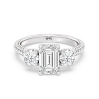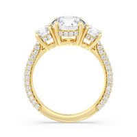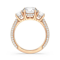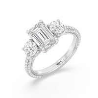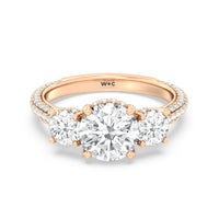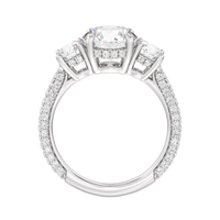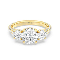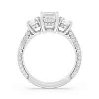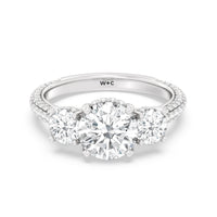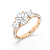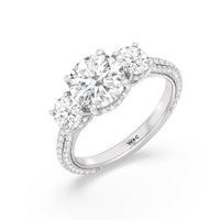 Dazzle her with the enchanting refinement of this three stone engagement ring. This stunner features a gorgeous Round-cut diamond center and side stone mounted on a four-prong basket with a glittering hidden halo. The cathedral shank's arching shoulders are traced with a triple row of diamonds, gracefully running more than halfway around the band.