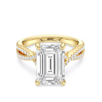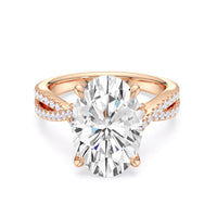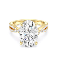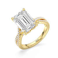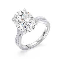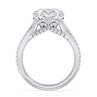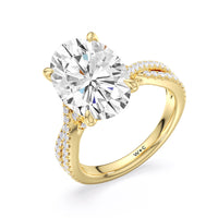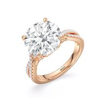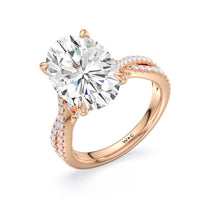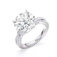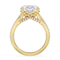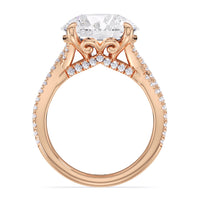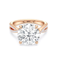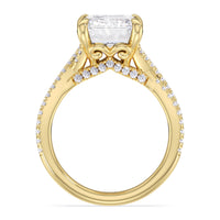 This engagement ring exudes regal charm, while still remaining timeless. The band twists gracefully leading up to the center diamond with accents along the bridge, visible from the front or back. A decorative accent is added along the gallery, making for a unique touch for your love story.