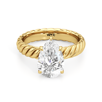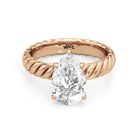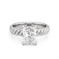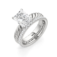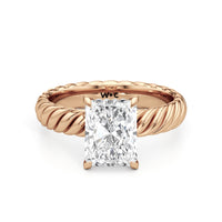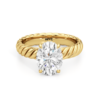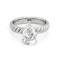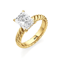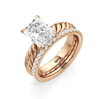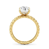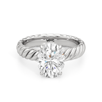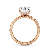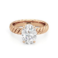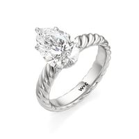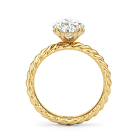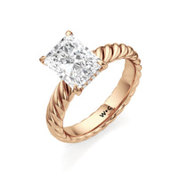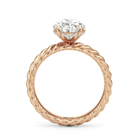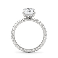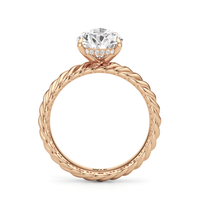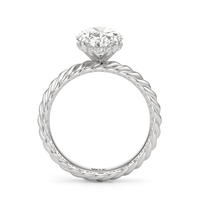 Eve captures movement in its form. The band, inspired by a gentle, flowing breeze, features a rope-like texture that winds softly around the finger. A lone diamond sits at the top, framed by a hidden halo for added brilliance. Like the promise this ring represents, its design speaks of connection and continuity.