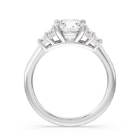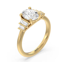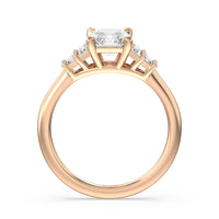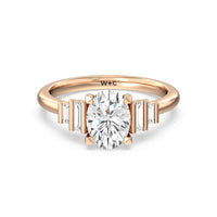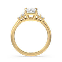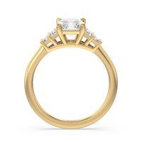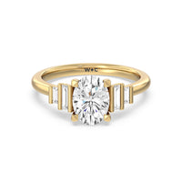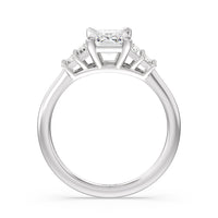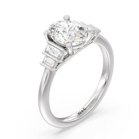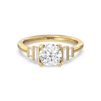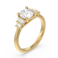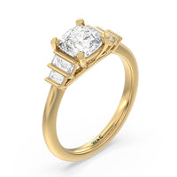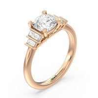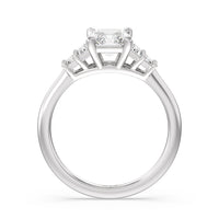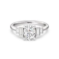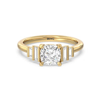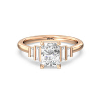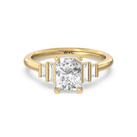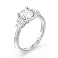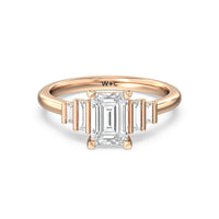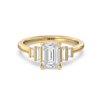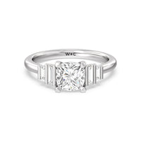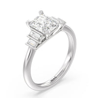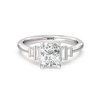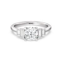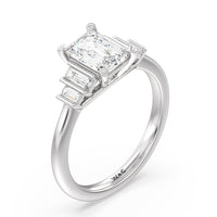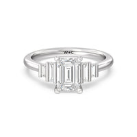 Step out from the traditional engagement ring by choosing this geometric beauty. Infused with Art Deco brilliance, this dashing piece features a large and sparkly diamond center stone flanked by angular side stones from the step-cut family. The sleek sophistication of this ring is what gives it a unique individuality.