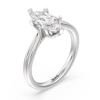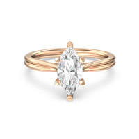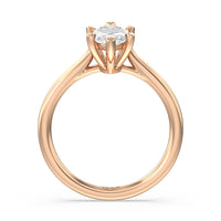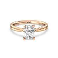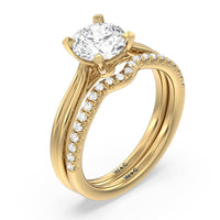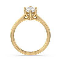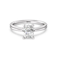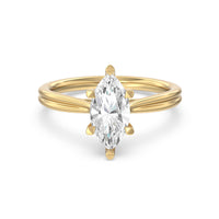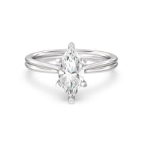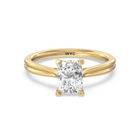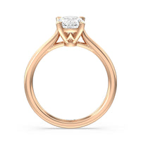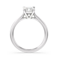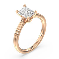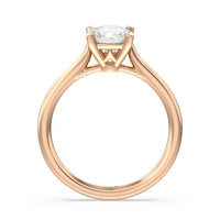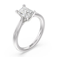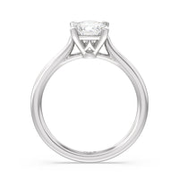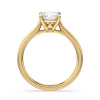 This diamond solitaire has a design aesthetic that feels of the moment and timeless at once. The elegance of its lone diamond is enhanced by the classic cathedral setting and the modern tapering band with grooved shoulders.