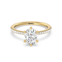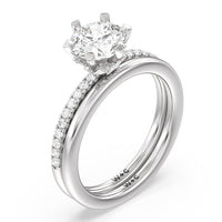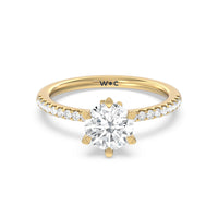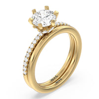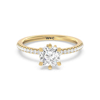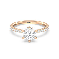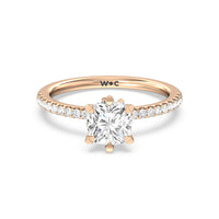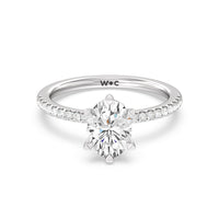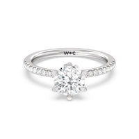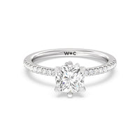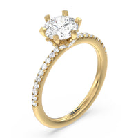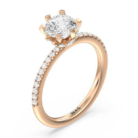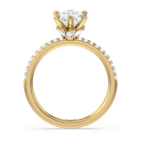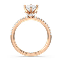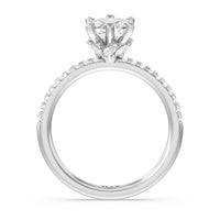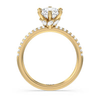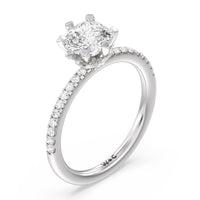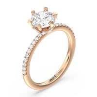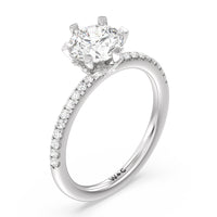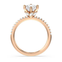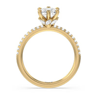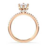 This ring is classic and modern in feel at once. It has a delicate and timeless beauty given the stand-out center diamond in a six-prong setting further emphasized by the pave-set diamonds on the shank. Giving the ring a luxurious and trend-forward finish is a hidden halo of marquise diamonds.
