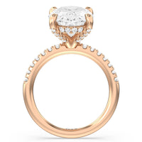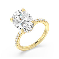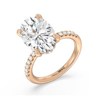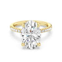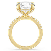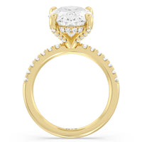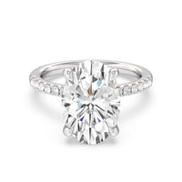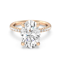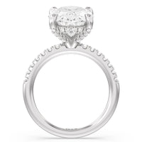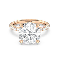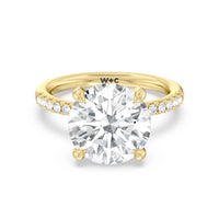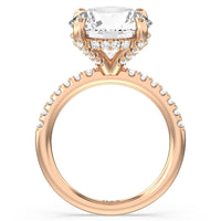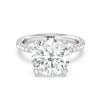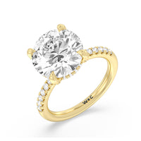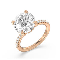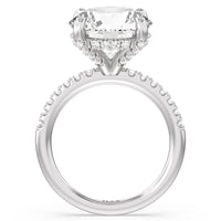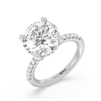 Seamlessly and sophisticatedly understated, this pavé solitaire ring impresses with its quiet elegance. The band's shoulders are traced with tiny diamonds that further highlight the brilliance of the 6-carat diamond center stone. The central gem is set on a four-prong setting with the prongs and rail also traced with diamonds.