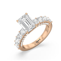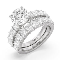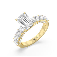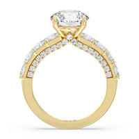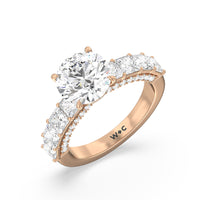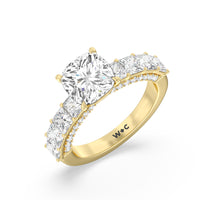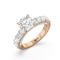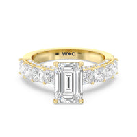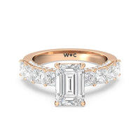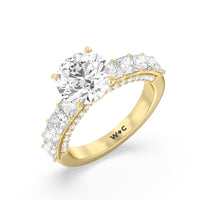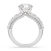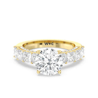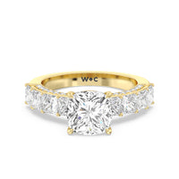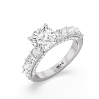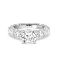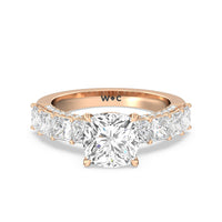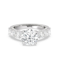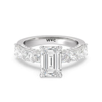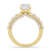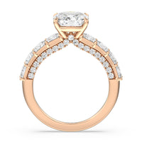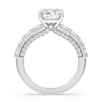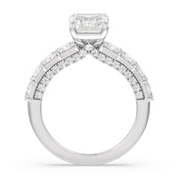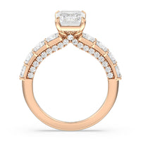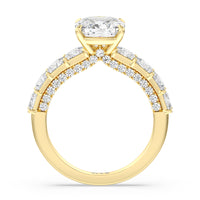 This ring is a picture of refined glamour. It sparkles at all angles with its studded shoulders lined with prong-set princess-cut diamonds and its pavé accented sides with small round diamonds. Set high above the band is a lab-grown diamond center stone that shines as brightly as a mined one.