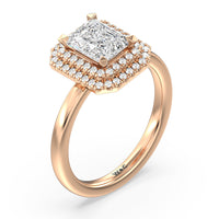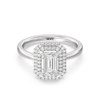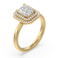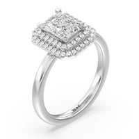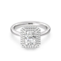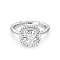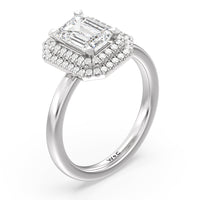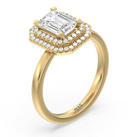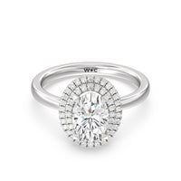 True to your unique love story is this one-of-a-kind engagement ring with an understated avant-garde aesthetic. Its smooth and polished band is topped by a show stopping centerpiece with a diamond center stone encircled by a double halo of diamonds. The two rows of diamonds surrounding the center stone are set in an asymmetric base reminiscent of Saturn's tilt.