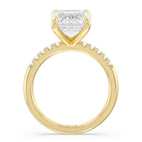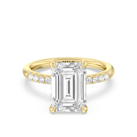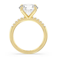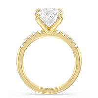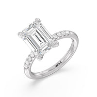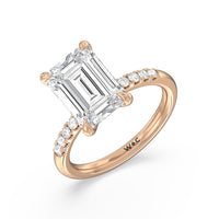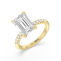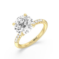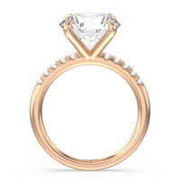 The simplicity and elegance of this ring make it all the more attractive. On each of the band's shoulders are five petite diamonds on U-shaped prongs, tracing the path to an appealing 5-carat diamond center stone. Sleek and modern claw prongs secure the central diamond in place.