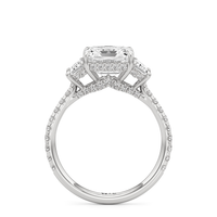 A modern three-stone engagement ring for the bride-to-be. This ring with a cathedral setting boasts a duo of uncommon trapezoid-cut diamonds flanking your choice of center stone. Each of the three main gems is further adorned with petite round diamond accents set on narrow bands parallel to the diamond's girdle. Round diamonds on micro prongs also adorn the stylized bridge and the sloping shoulders of the ring.