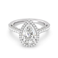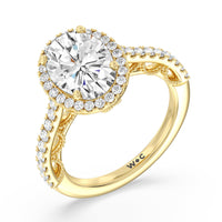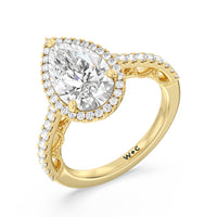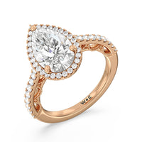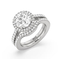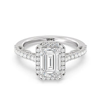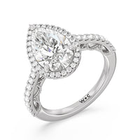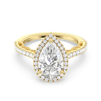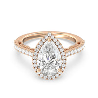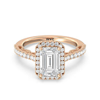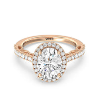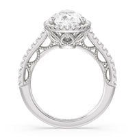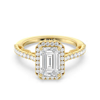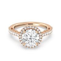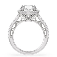 Inspired by the Georgian era, this vintage-style engagement ring displays a dazzling floral basket featuring intricate milgrain detailing. An impressive center stone is surrounded by a glittering halo, held in place by a 4-prong setting within the beautifully sculpted milgrain drape gallery work, adding depth and elegance. The cathedral shank's arching shoulders showcase graceful curves, complemented by the delicate sparkle of a pavé band. A timeless choice for those seeking a milgrain halo engagement ring with heirloom charm.