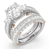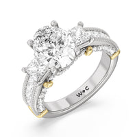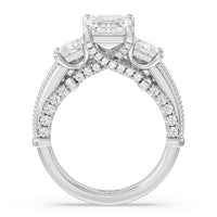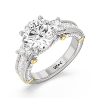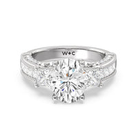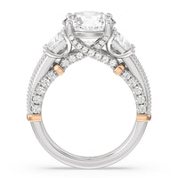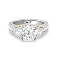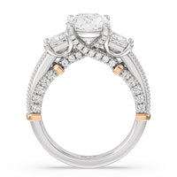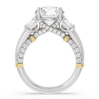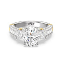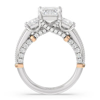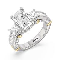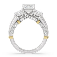 Elaborate without being over-the-top, this diamond engagement ring wows with its retro aesthetics. It features a three-stone setting, with a princess-cut diamond side stone on each side of the central gem. Interweaving U-shaped prongs traced with diamonds and punctuated by yellow gold collars make up the decorative bridge and gallery that completes the vintage opulencce of this piece