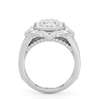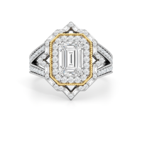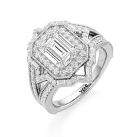 This elegant ring draws inspiration from The San Remo’s twin-towered Art Deco splendor, with an emerald-cut center stone whose clean lines echo the building’s stately form. V-shaped patterns and a split shank reflect its pointed crown and decorative spires, while milgrain detailing adds refined texture. Baguette and baby pavé round diamonds bring brilliance across the halo, band, and bridge, capturing the building’s timeless glamour.