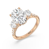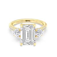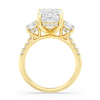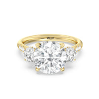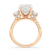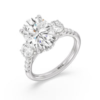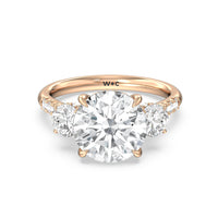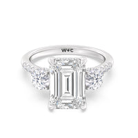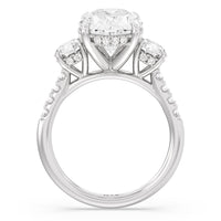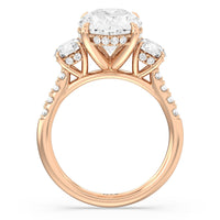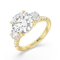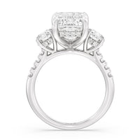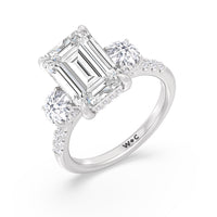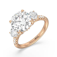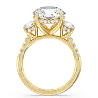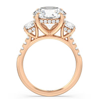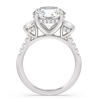 Beautiful, romantic, and deeply meaningful, this three stone engagement ring is a breathtaking symbol of your love story’s past, present, and future. The design impresses with a spectacular diamond center, flanked by round side stones, each weighing 0.5 carats. Adding to its brilliance, hidden halos on all three stones provide a radiant glow from every angle. Secured with claw prongs, this design exudes quiet luxury, making this luxury hidden halo a visual treat that is timeless.