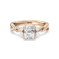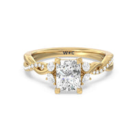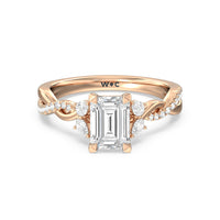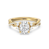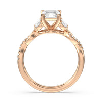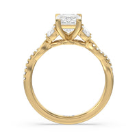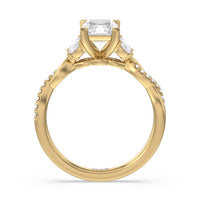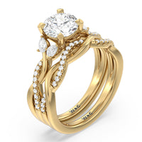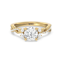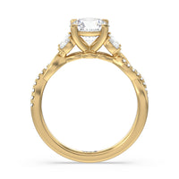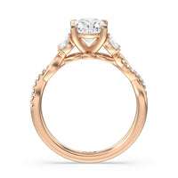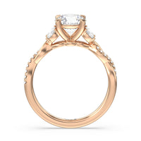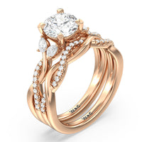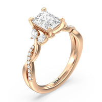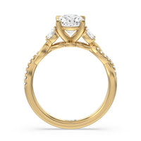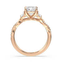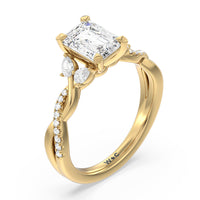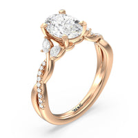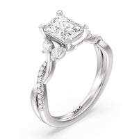 A radiant illustration of two halves becoming whole. This ring features two vine-like shanks twisting -one shiny and another showy - and meeting at a central point marked by a dazzling diamond. The center gem is elegantly framed by the sparkle of pear-shaped diamond side stones.