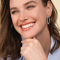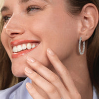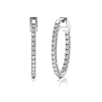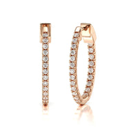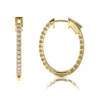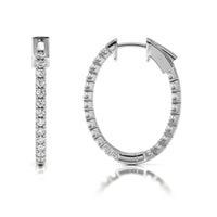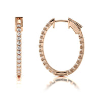 These oval shaped hoop earrings are crafted in 14k gold featuring a line of shimmering round cut brilliant diamonds. The inside out designs ensure that your exquisite diamonds can be admired from every angle.