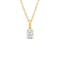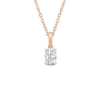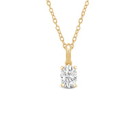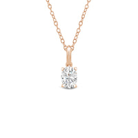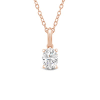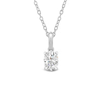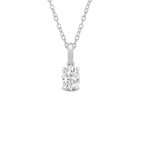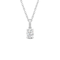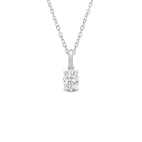 This solitaire pendant has the perfect mix of style and simplicity. The high-quality diamond in oval shape is secured by four prongs. It gently drops from a white gold bail with a knife-edge detail.