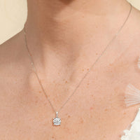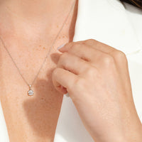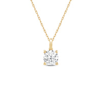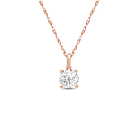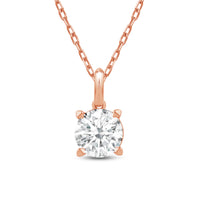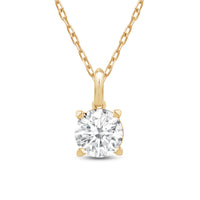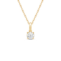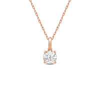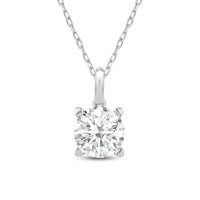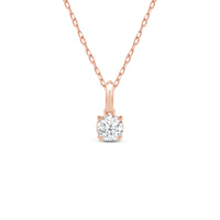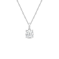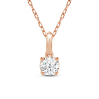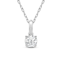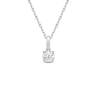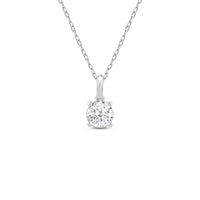 The perfect sparkler to spice up your accessorizing game. This solitaire pendant features a round diamond secured by a compass four-prong setting. The knife-edge bale brings that unexpected touch of edginess to this elegant piece.