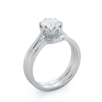 To make sure the lovely profile of your Lily Diamond Engagement Ring stays exactly the way you like, we designed this matching wedding band to curve around the base. The flat band hugs just below the blossoming metal petals to make sure your two rings work together as a wedding ring stack.