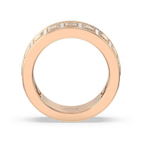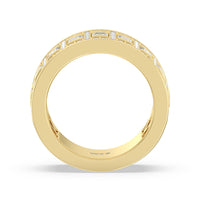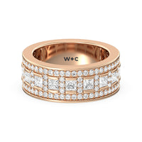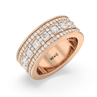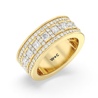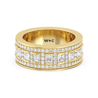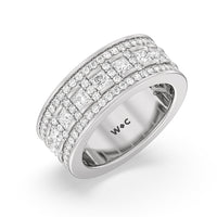 The geometric elegance of this ring distinguishes it from other anniversary bands. This stunner features a wide and flat band that subtly tapers in size towards the back. The ring offers tons of shine with its polished finish complemented by a sparkling pattern of round diamonds on shared prongs and princess-cut diamonds on half bezels.