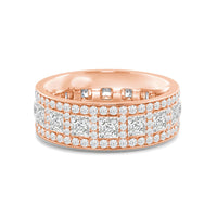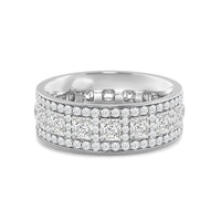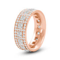 A particularly luxurious symbol of everlasting love - for a romantic partner or for yourself. This eternity ring features a wide band embellished with a series of princess-cut diamonds. Rows of round diamonds neatly frame each princess-cut gem.