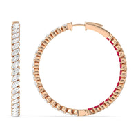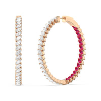Skip the traditional hoops and go for this edgy yet elegant alternative. These large hinged hoop earrings come fully lined, in front and front-facing backside, with marquise-cut diamonds and created ruby mounted in a diagonal manner. The earrings exude a look that's classy yet unique, and definitely chic.