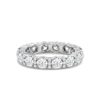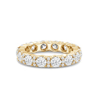 An eternity band that shines with infinite sophistication. This shapely ring features a series of round diamonds set in a pattern, alternating between large round diamonds and trios of micro pave round diamonds. The band displays a scalloped silhouette as it follows the rounded edge of each gem.