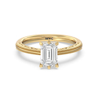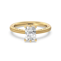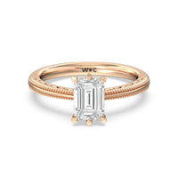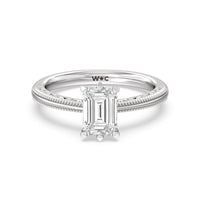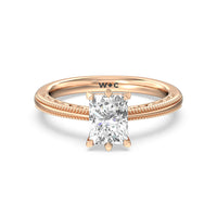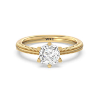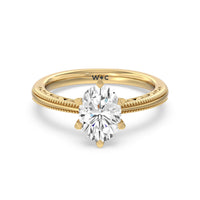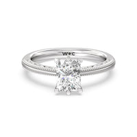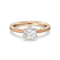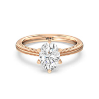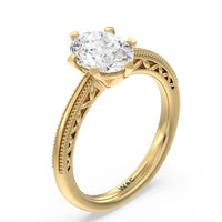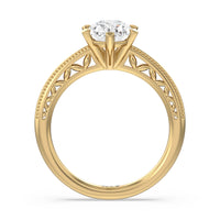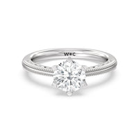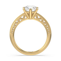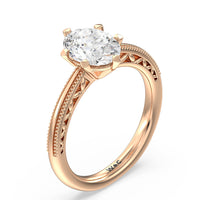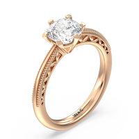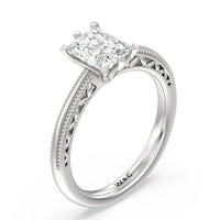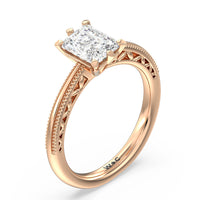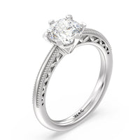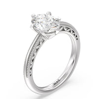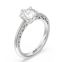 Not your ordinary solitaire. This reinvented piece offers a look that's a little less conventional given the intricate filigree and milgrain detail work on the tapered band. This ring enchants whether viewed from the top or the side.