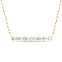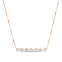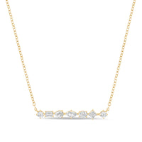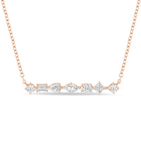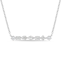 This diamond stunner serves up major style points even in its minimalist form. The white gold necklace features a series of diamonds in mixed fancy shapes. Round, emerald, pear, marquise, oval, and princess-cut diamonds form a straight line and display an effortless sparkle.