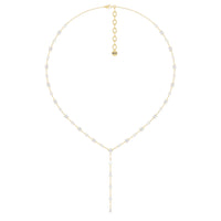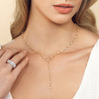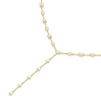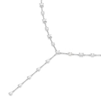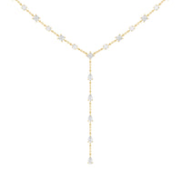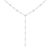 A elegant necklace with effortless appeal. This diamond station lariat necklace is a versatile piece that can be worn with an assortment of outfits. It has a Y-shaped chain adorned with prong-set diamonds that are evenly spaced for a clean look. The rounded upper part of the necklace features round and princess-cut diamonds while the linear drop that forms the Y tail has pear-cut diamonds.