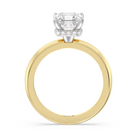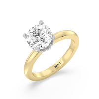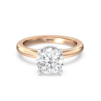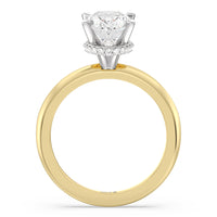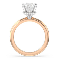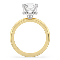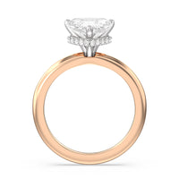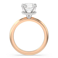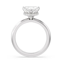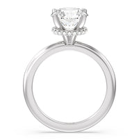 Modern in it's simplicity, the clean, fluid lines of this classic solitaire engagement ring pair with an intricate line of pave diamonds in a hidden halo design and signature claw details to create a truly luminous effect which sparkles from all angles.