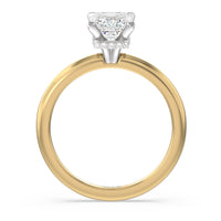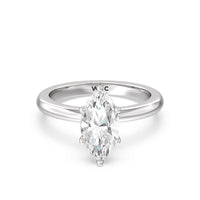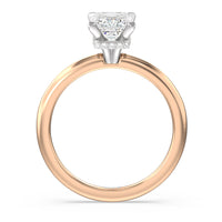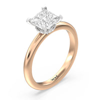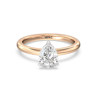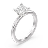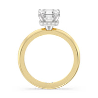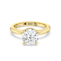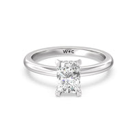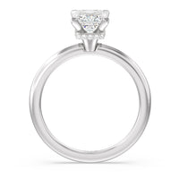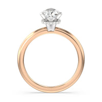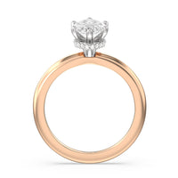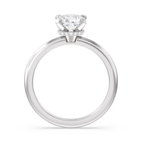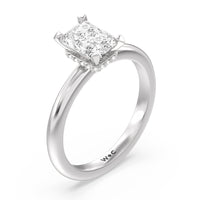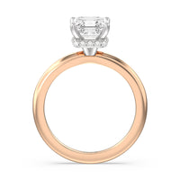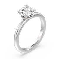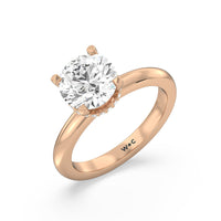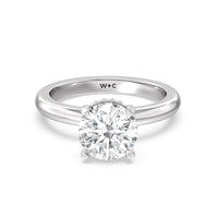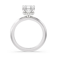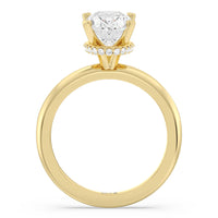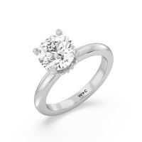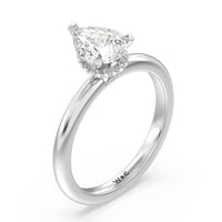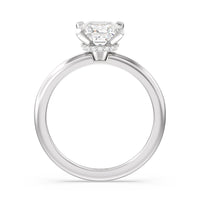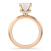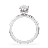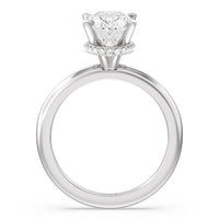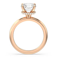 Modern in it's simplicity, the clean, fluid lines of this classic solitaire engagement ring pair with an intricate line of pave diamonds in a hidden halo design and signature claw details to create a truly luminous effect which sparkles from all angles.