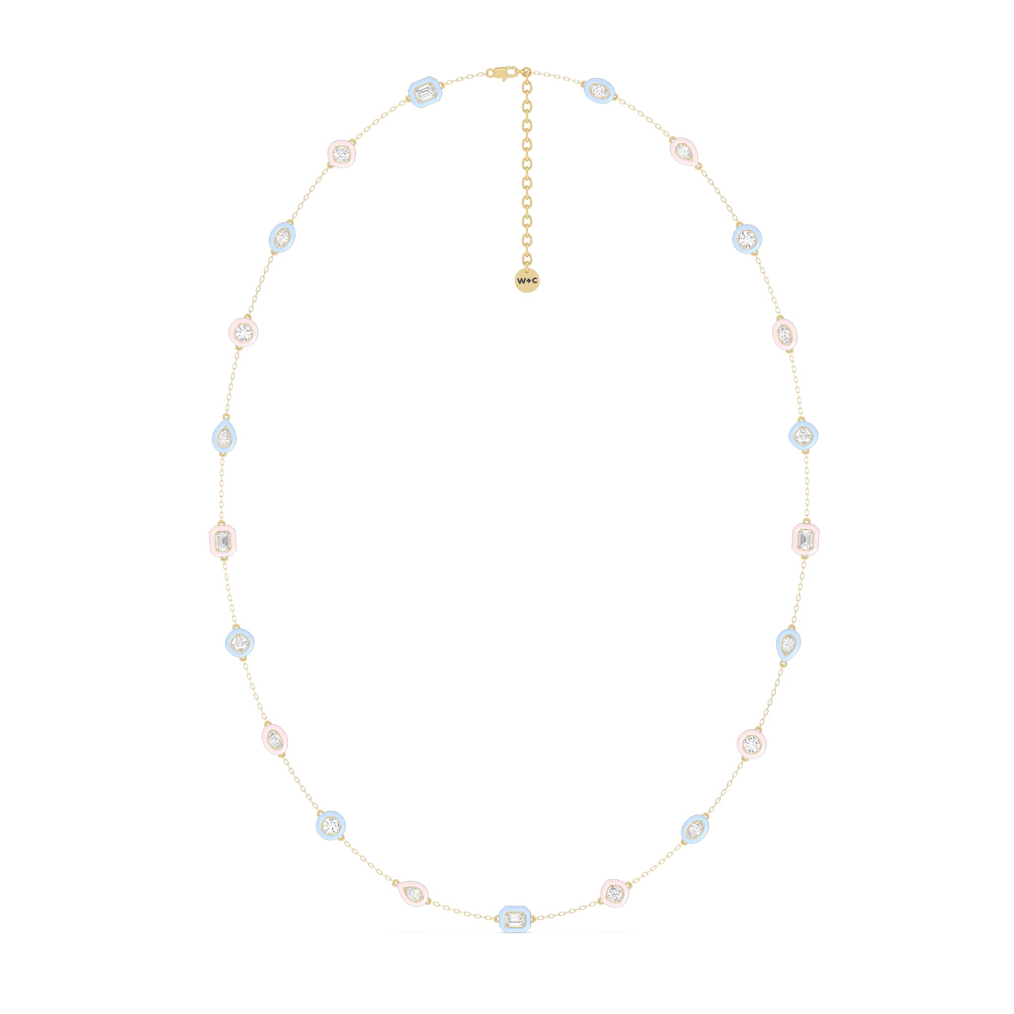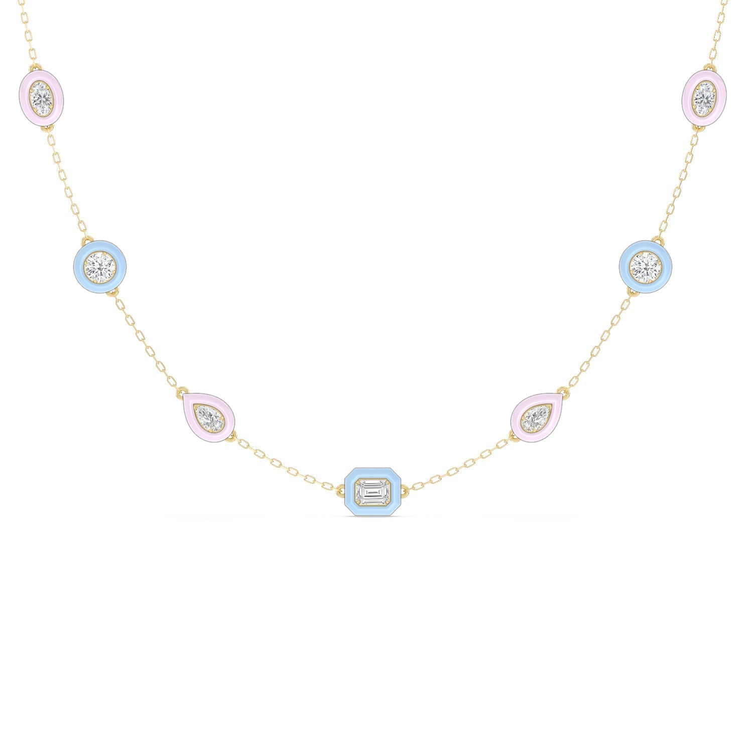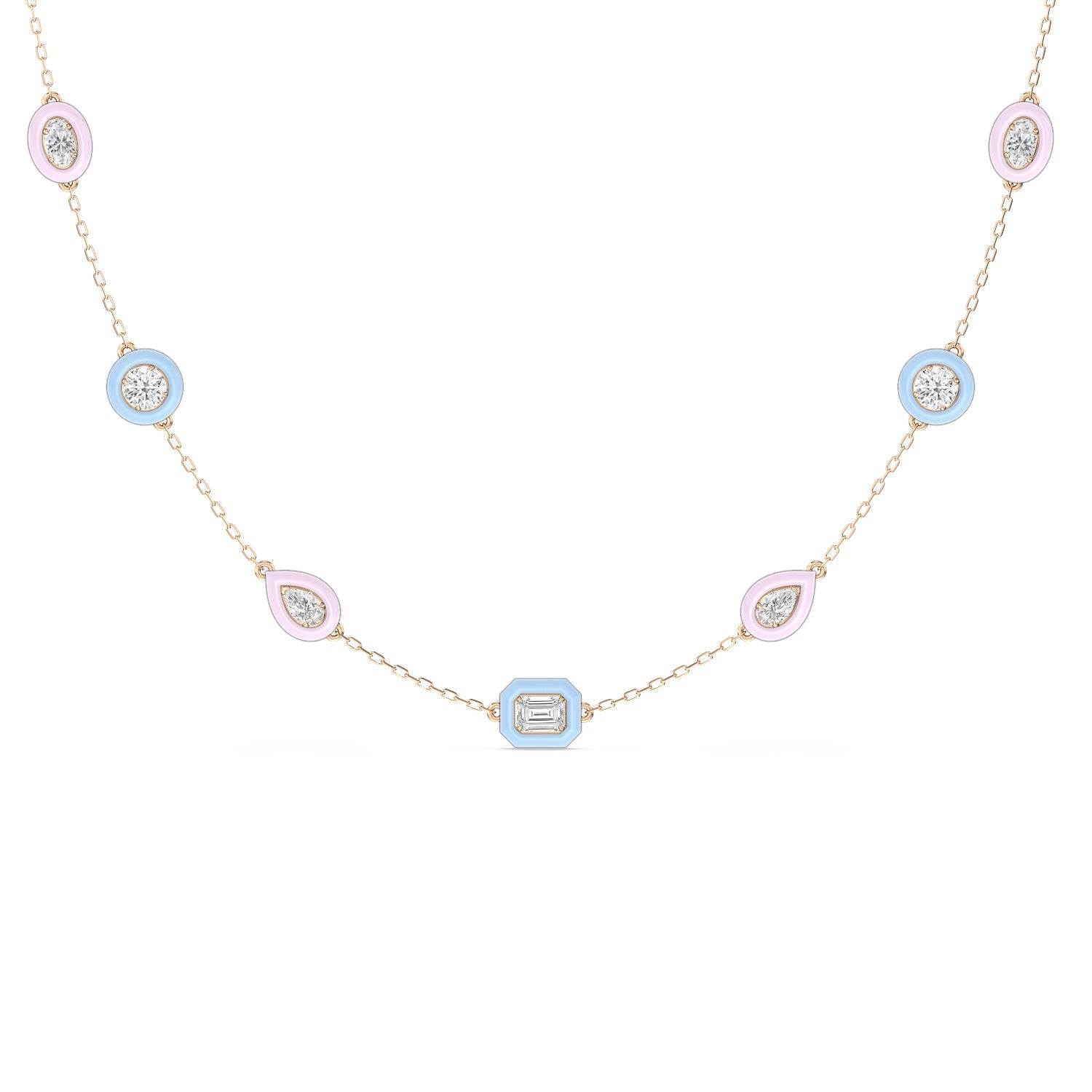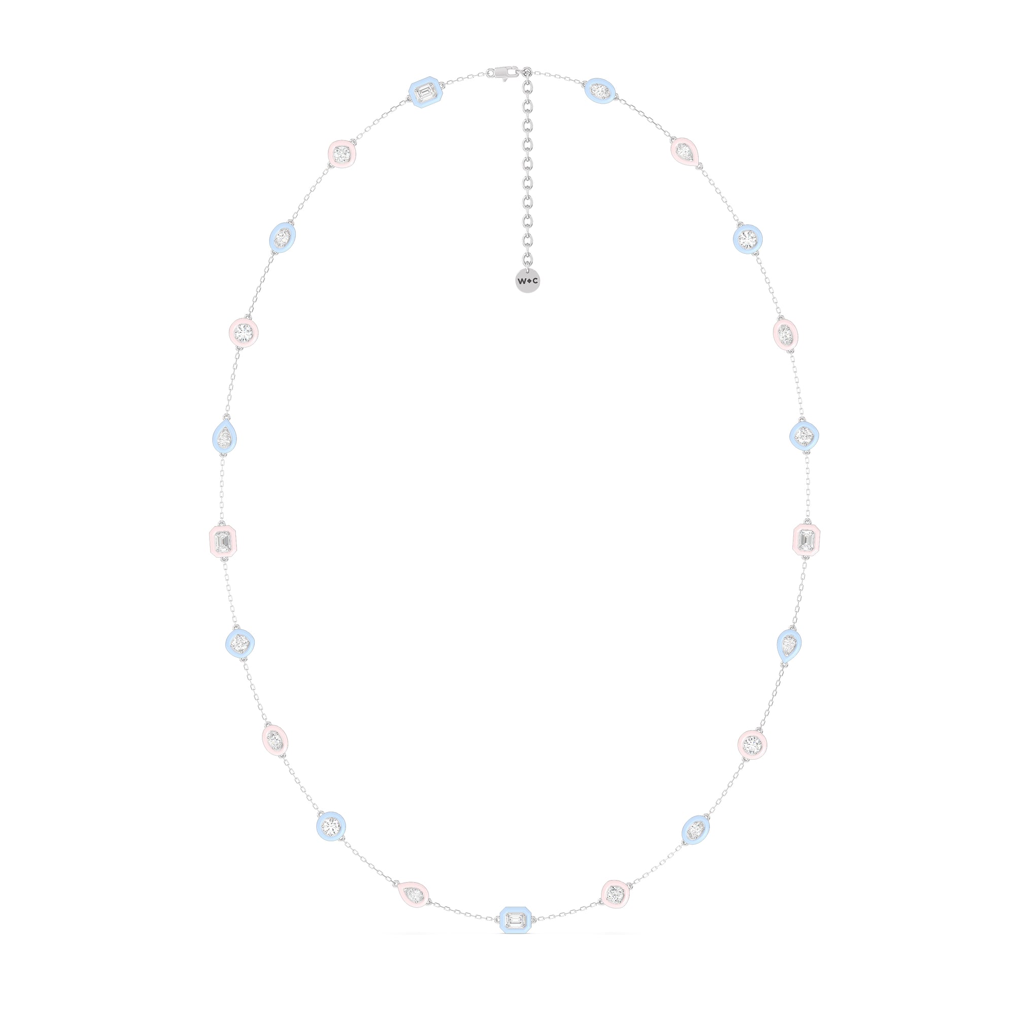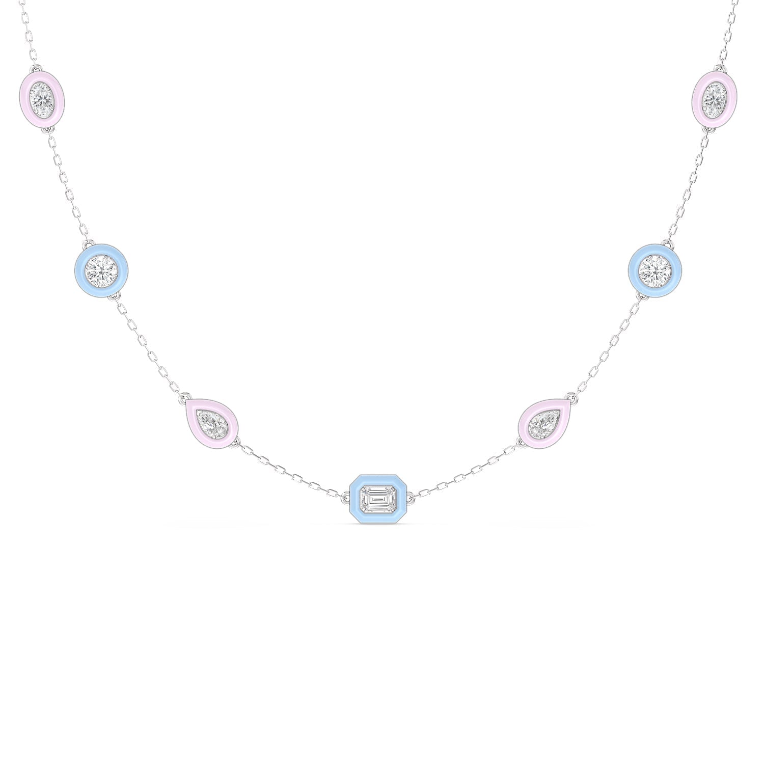 The combination of brilliance and vivid hue makes this ceramic necklace a favorite. The whimsical chain features a series of oval, pear, emerald, round, and cushion-cut diamonds set on evenly spaced stations along a necklace chain. Each brilliant gem is set on a ceramic bezel that offers a vibrant burst of color.