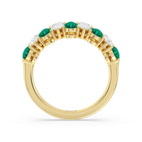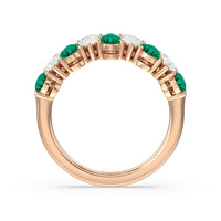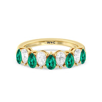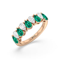 Think beyond the basics and opt for this half-eternity ring with a dazzling play on geometry. It features a polished band topped with an arching row of pear-shaped diamonds and created Emerald in alternating north-south patterns. Your fashion-loving significant other is sure to appreciate the bold style of this anniversary ring.