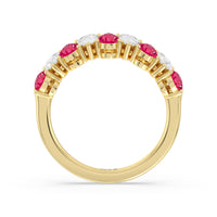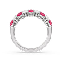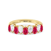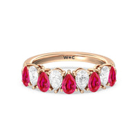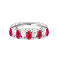 Think beyond the basics and opt for this half-eternity ring with a dazzling play on geometry. It features a polished band topped with an arching row of pear-shaped diamonds and created Ruby in alternating north-south patterns. Your fashion-loving significant other is sure to appreciate the bold style of this anniversary ring.