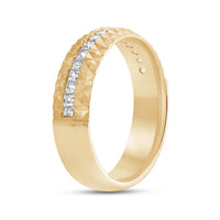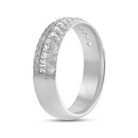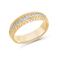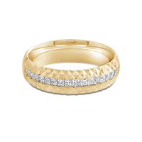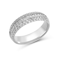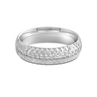 A man with a bold taste will love the edgy and unconventional yet refined look of this band. The ring features a tiered design with a circle of diamonds positioned below a pattern of light-reflecting pyramidal notches.