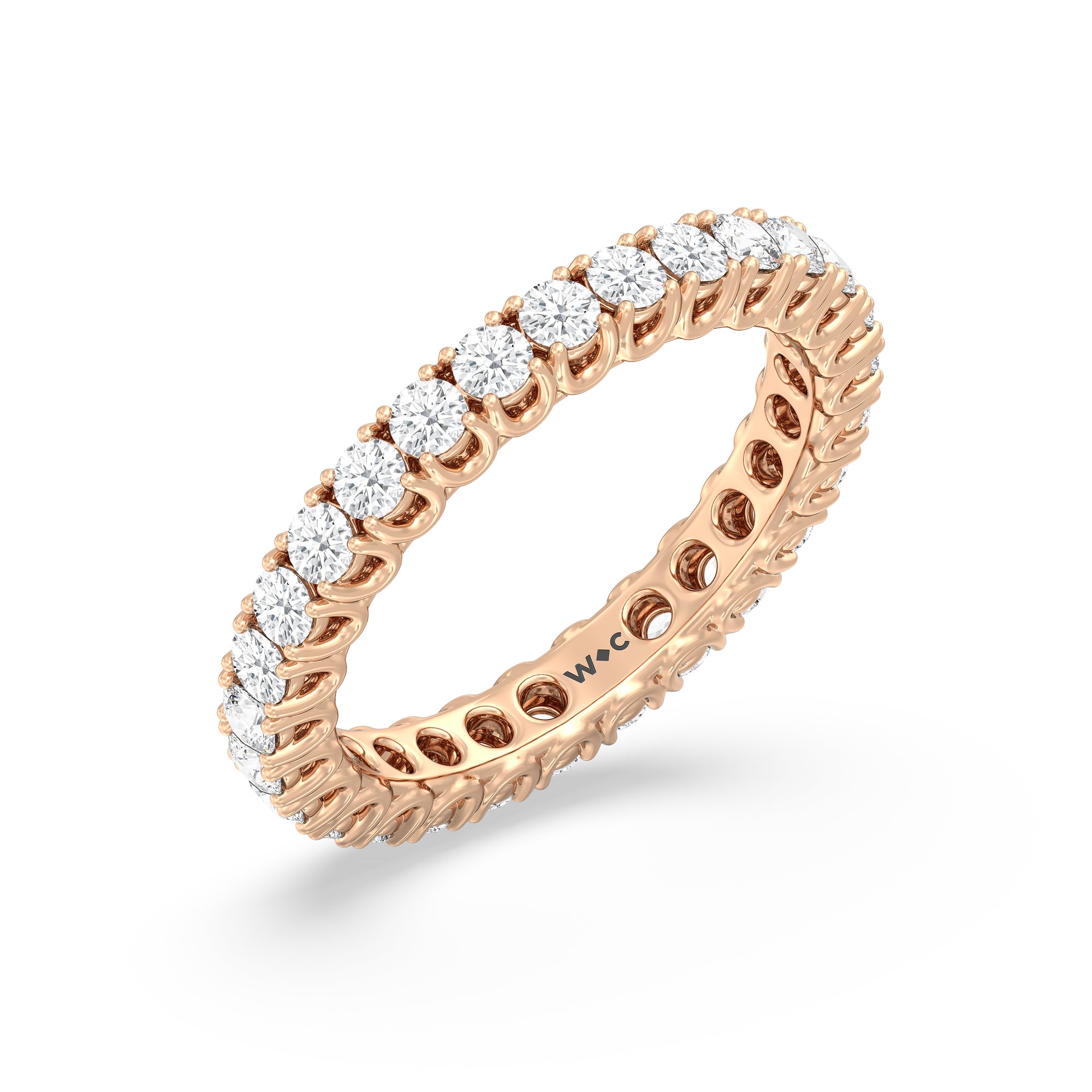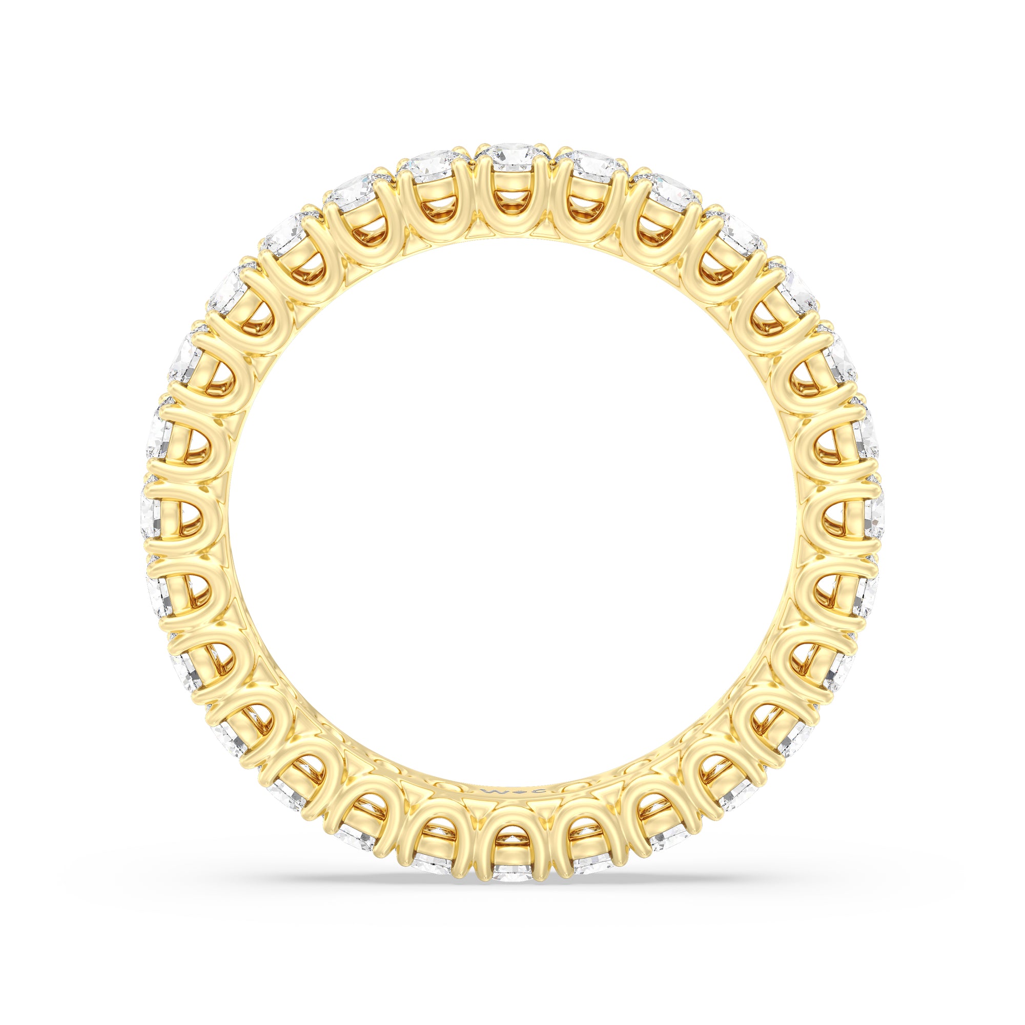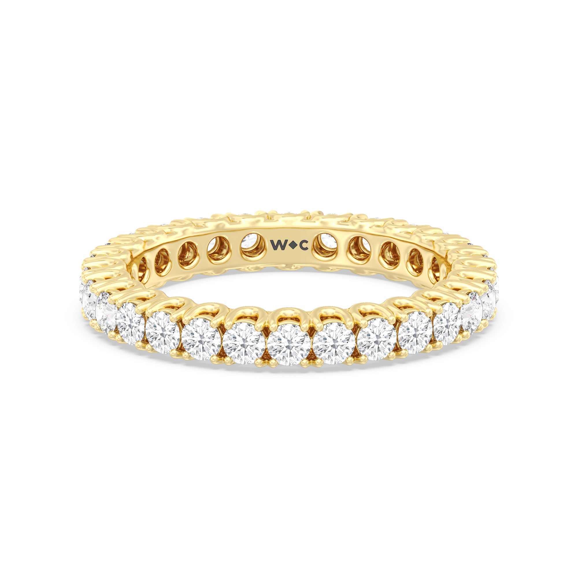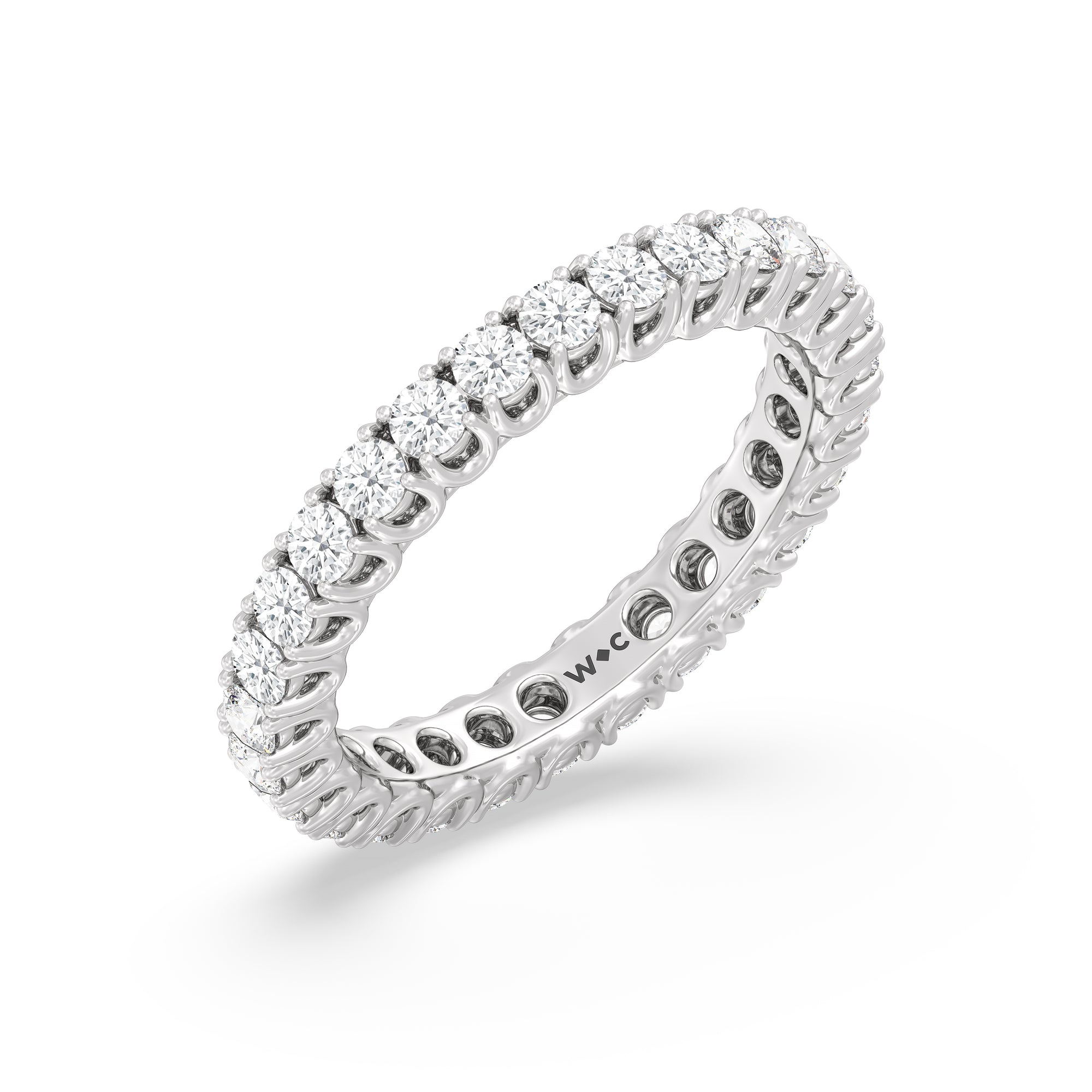 Express your unfaltering love for your one and only through this diamond eternity ring. The band features a series of U-shaped prongs elegantly securing the brilliant round diamonds. This ring undeniably makes a gorgeous symbol of forever.