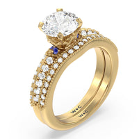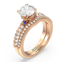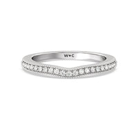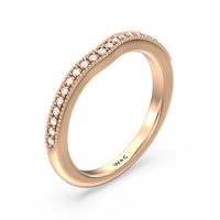 This slightly curved diamond set wedding band is perfectly contoured to complement our something blue orchid knife edge engagement ring for a simple and sophisticated look.