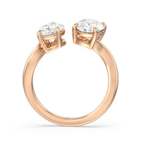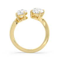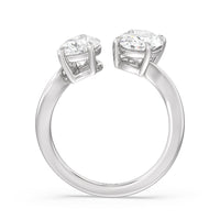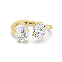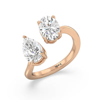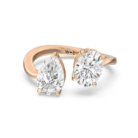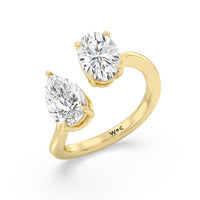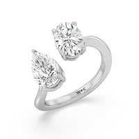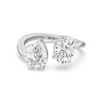 Begin your forever with a dazzling two-stone stunner that elegantly twists and shines. This luxurious engagement ring features a curvaceous band with a pear diamond and an oval diamond meeting at the center. Nicknamed "toi et moi" or you-and me, this ring design symbolizes the meeting of two souls and their harmonious union.