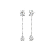 Modern minimalist luxury radiates from this pair of diamond earrings. Each earring glistens with an oval diamond post. Dangling from it is a short linear chain drop with a teardrop diamond at the end. The refined style of this pair makes it perfect for everyday wear and special occasions.