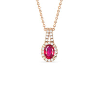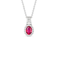The refined elegance of this gemstone pendant allows you to elevate the look of any outfit in an instant. The pendant features a Oval Created Ruby on its center framed by a classic halo of lab-grown diamonds. A diamond-studded split bale holds the halo-wrapped colored gem.