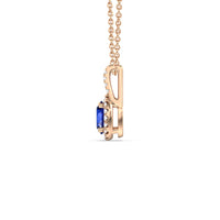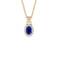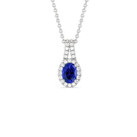 The refined elegance of this gemstone pendant allows you to elevate the look of any outfit in an instant. The pendant features a Oval Created Sapphire on its center framed by a classic halo of lab-grown diamonds. A diamond-studded split bale holds the halo-wrapped colored gem.