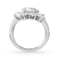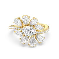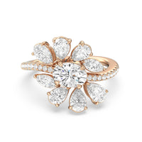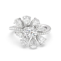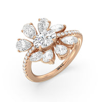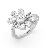The Gardenia Ring, a symbol of love and refinement is designed with a curvy band lined with diamonds. The topped floral motif is composed of pear diamond petals and a striking oval diamond center stone.