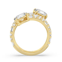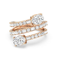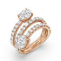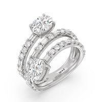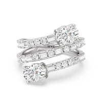Here is something you can add to your daily jewelry rotation. This triple spiral ring glitters in style with its triple-band design. The three slender shanks are all lined with diamonds of varying cuts, set in a pattern. The two ends of the spiraling silhouette are punctuated by striking oval diamonds on four prongs.