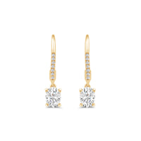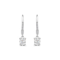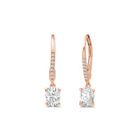 You don't have to reserve these drop earrings for a girly look. Put these on and still look powerful while embracing the grace and softness within you. These drop earrings with lever backs feature a row of diamonds lining the front face of the hoop. Gently dangling from it is a faceted oval diamond secured by four claw prongs.