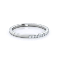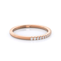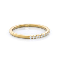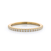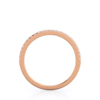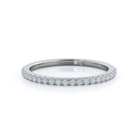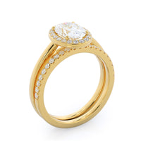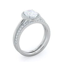 Thanks to your center diamond's vaulted position, this pave wedding band actually sits under your oval diamond and its halo setting. From above that means these two rings look like one gorgeous unit, for a wedding ring stack that works as well together as you and your future spouse.