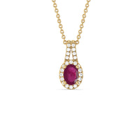 The refined elegance of this gemstone pendant allows you to elevate the look of any outfit in an instant. The pendant features a Oval Ruby on its center framed by a classic halo of lab-grown diamonds. A diamond-studded split bale holds the halo-wrapped colored gem.