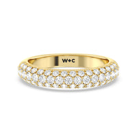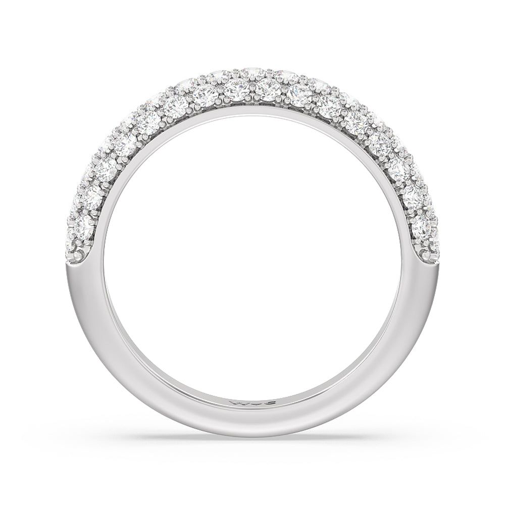 This anniversary band offers plenty of sparkles. Round diamonds span halfway around the band, covering the top and the sides of the shank with gorgeous glitter. This beautiful ring is the perfect reflection of the blissful and radiant love you share.