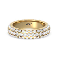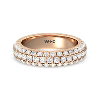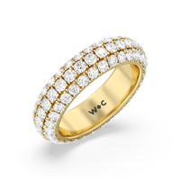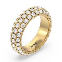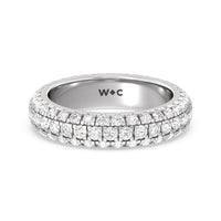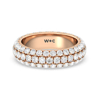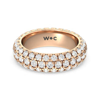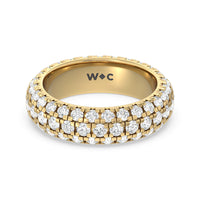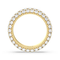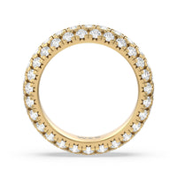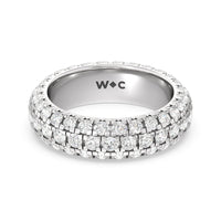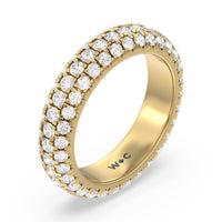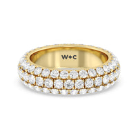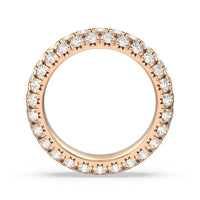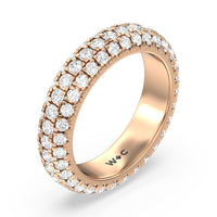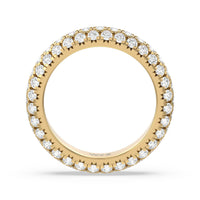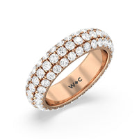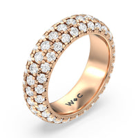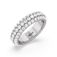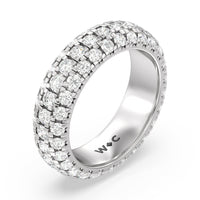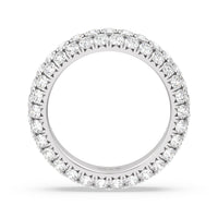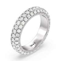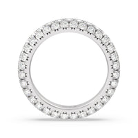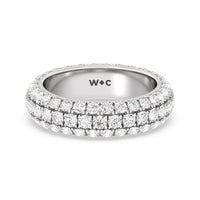 A diamond eternity band designed to deliver major sparkle. The incredible shine of this domed ring comes from round diamonds carefully and decoratively set on unique and modern micro prongs. How the diamonds were laid out gives a truly glamorous effect that is perfect for impressing the love of your life.