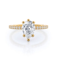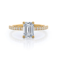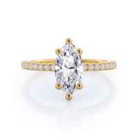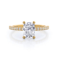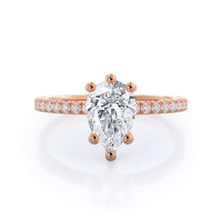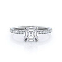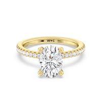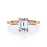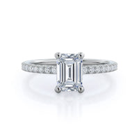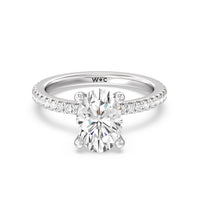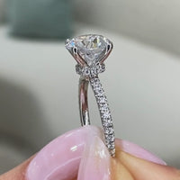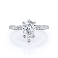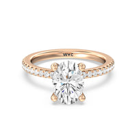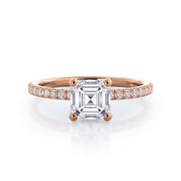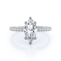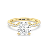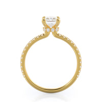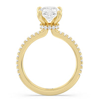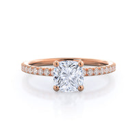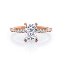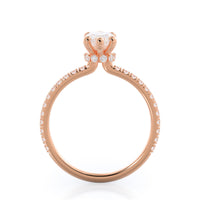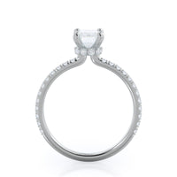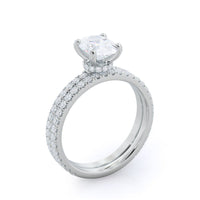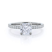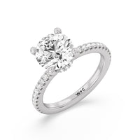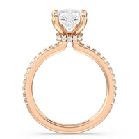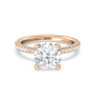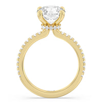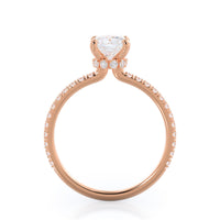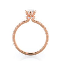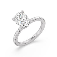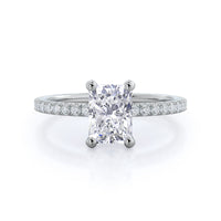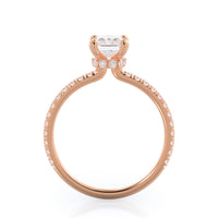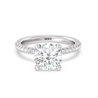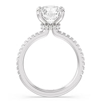A perfect blend of modern and symbolic design, this pave engagement ring is an exquisite choice for those seeking a diamond engagement ring with a distinctive touch. The stunning design showcases the center diamond with a unique under halo like a love knot, elegantly encircling the bottom of the stone. The pavé setting on the shank adds classic brilliance, with a 3/4 studded band enhancing its luxurious appeal.