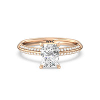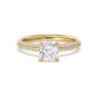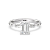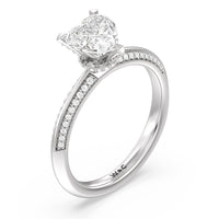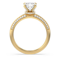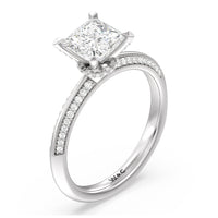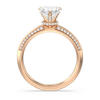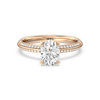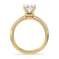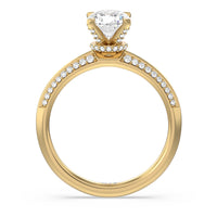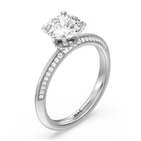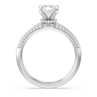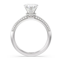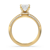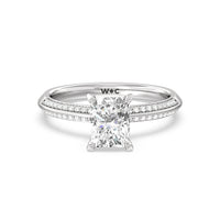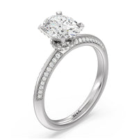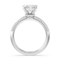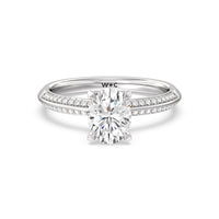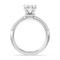This double row pave set diamond engagement ring features diamond accented claw prong and elegant hidden halo.