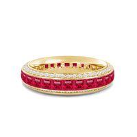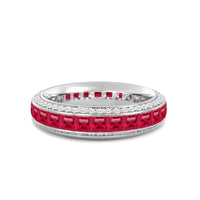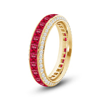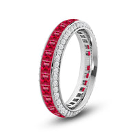 An exquisite eternity band featuring modern and edgy princess-cut Created Ruby in a channel setting. Adding edge to this beautiful piece are prong-set round diamonds tracing the shank's side circumference.