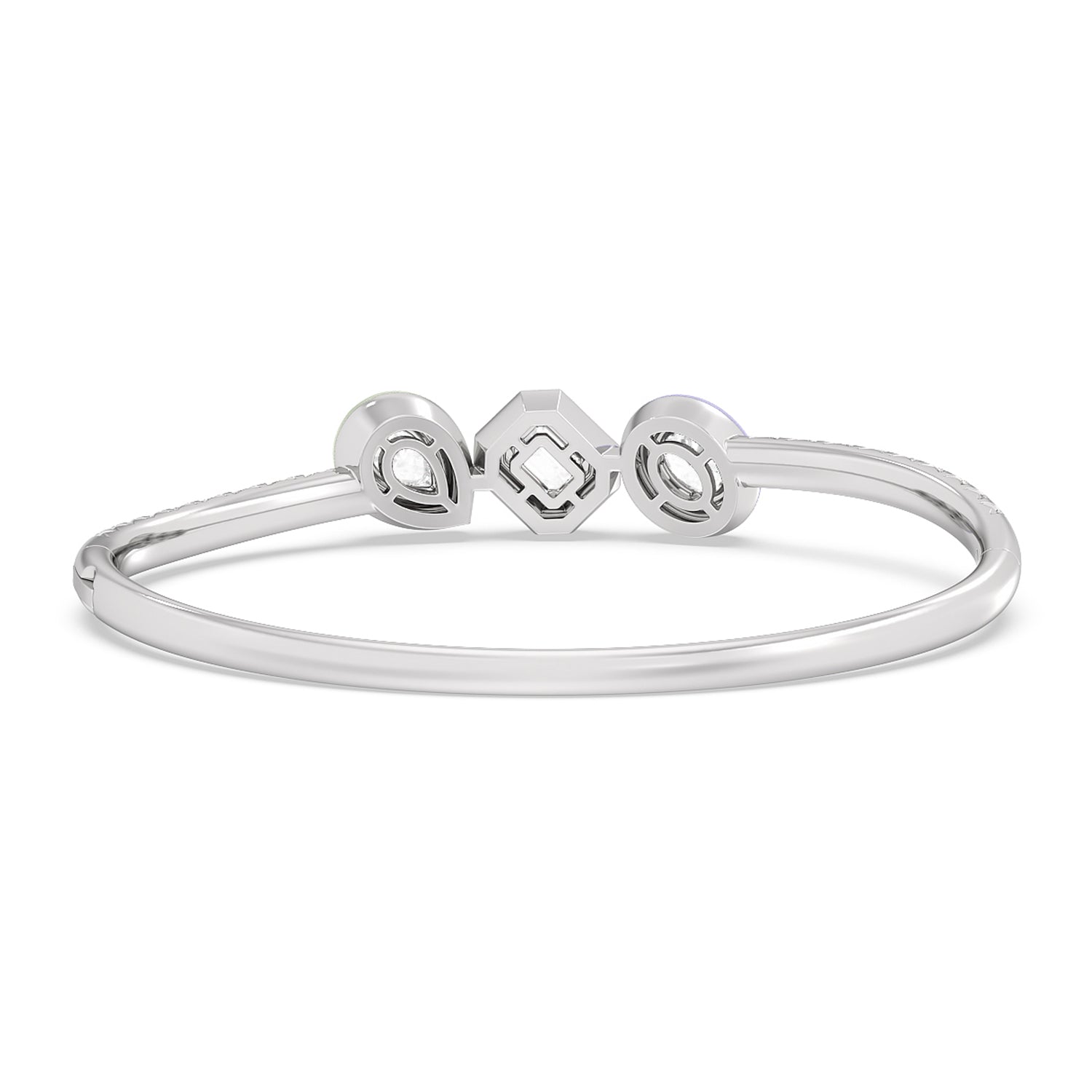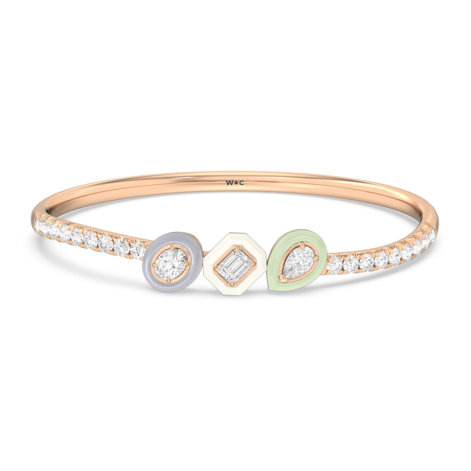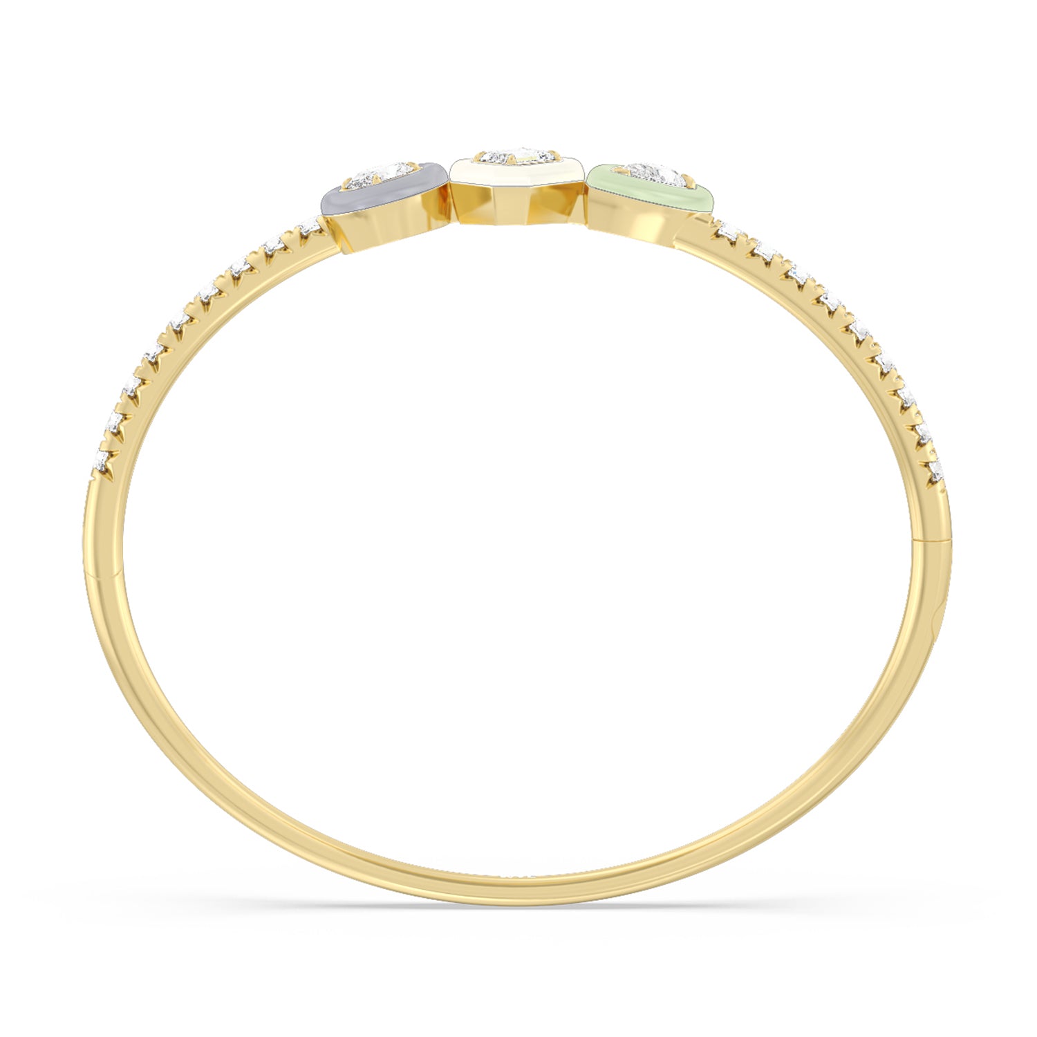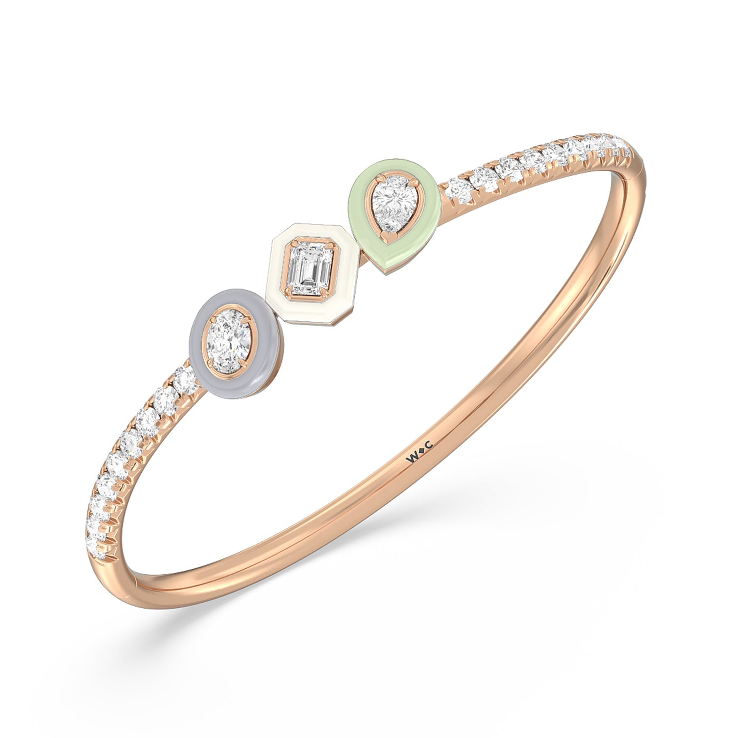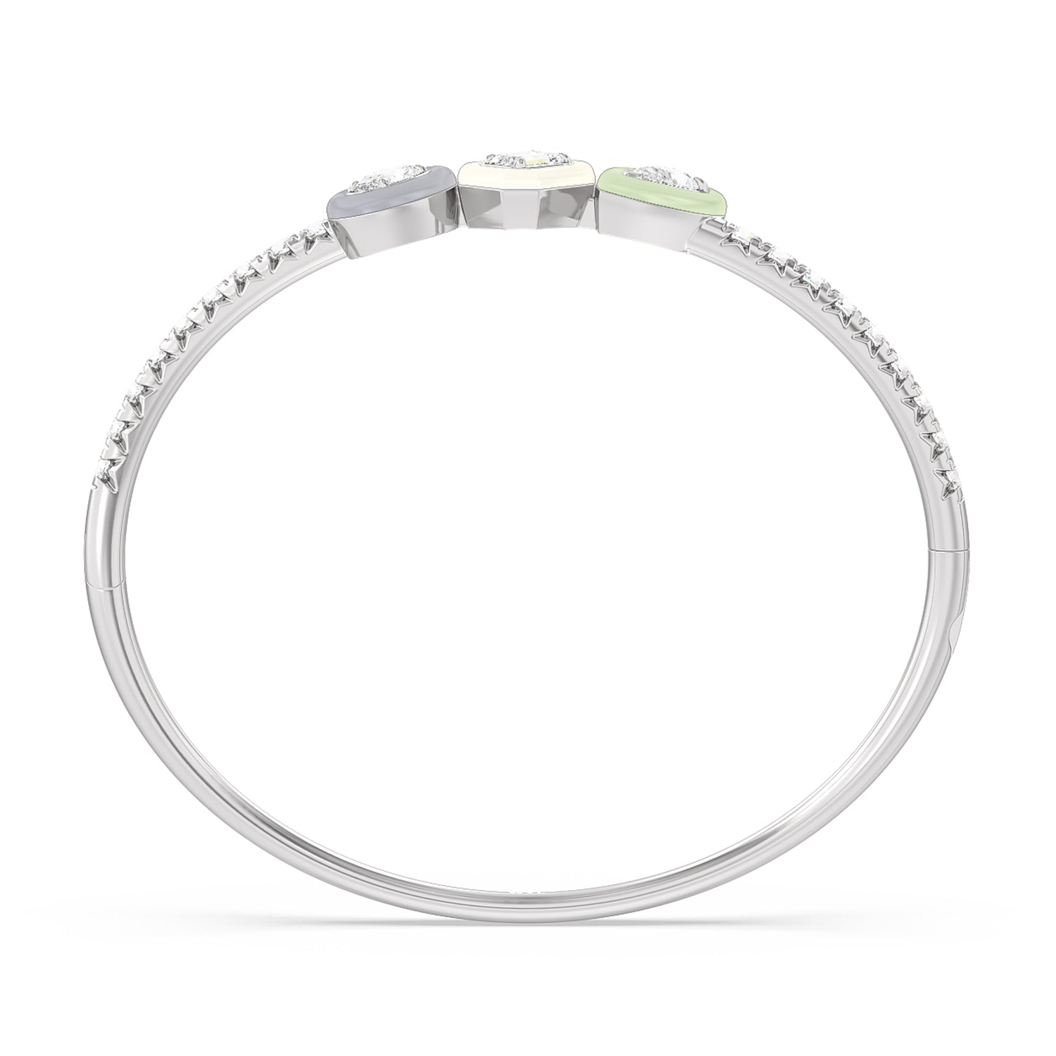 Worn alone or with your other favorites, this ceramic bangle adds an artistic twist. It features a wave of pavé-set round diamonds tracing half of the rigid bracelet's circumference. Three ceramic bezels holding oval, emerald-cut, and pear diamonds add a stylish pop of color.